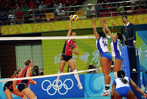 美国女排(红)与委内瑞拉女排(蓝)在激战中。最终美国女排以3:1战胜委内瑞拉女排。