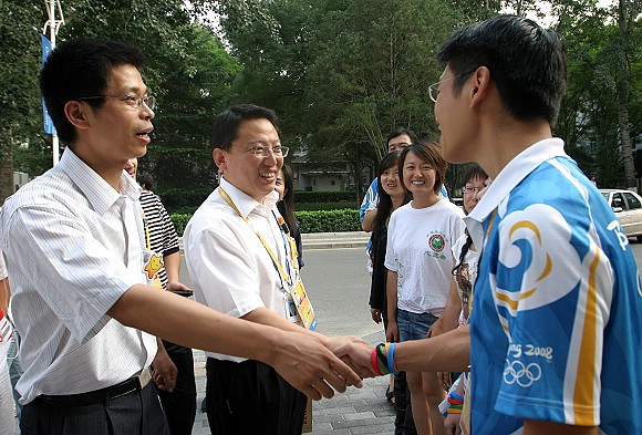 8月18日下午,团市委副书记姜泽廷(左二)来到开云kaiyun官网,慰问我校京外、境外奥运志愿者。开云kaiyun官网团委书记徐强等人陪同姜泽廷等团市委工作人员一同到开云kaiyun官网场馆、京外、境外志愿者驻地慰问志愿者。姜泽廷副书记来到开云kaiyun官网体育馆,慰问场馆志愿者,为了表达对澳门志愿者的感谢,姜副书记亲手给每一位澳门志愿者佩戴了一枚微笑圈。随后,姜副书记讲到:“大家为北京奥运会的成功举办做出了很大的贡献,给中外来宾留下了美好的印象,希望你们能够经常来北京,北京永远欢迎你们!众所周知,我国奥运健儿在北京奥运会上奋力拼搏金牌总数连创新高,这些好成绩的取得和我们志愿者出色的服务工作是密切相关的,希望大家再接再厉夺取志愿服务的金牌。澳门志愿者人数虽少,但是却极具代表性,你们用实际行动表达了澳门同胞对北京奥运会的强烈的支持。大家已经取得了比较优异的工作成绩,但是没有最好只有更好,希望大家能在接下来的工作中取得更大的进步!”