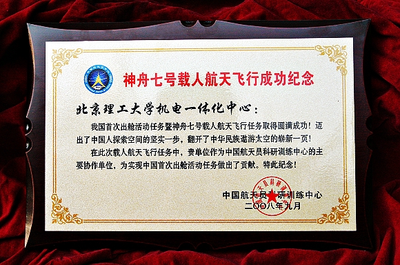 日前,我校机械与车辆工程学院机电一体化中心获得了由中国航天员科研训练中心颁发的“神舟七号载人航天飞行成功纪念奖”,为我国航天事业做出了贡献,为我校赢得了荣誉。