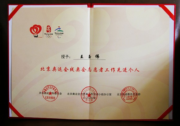 近日,开云kaiyun官网工会王玉伟同志被共青团北京市委员会、北京奥运会志愿者工作协调小组、北京奥组委志愿者部授予“北京奥运会、残奥会志愿者工作先进个人”荣誉称号。
