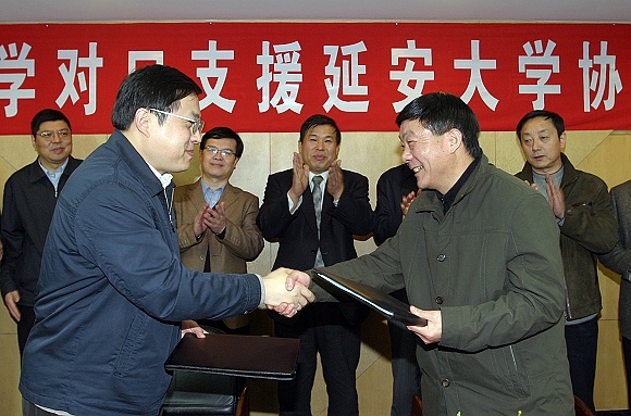 签字仪式上,我校赵显利副校长,延安大学王延奇副校长分别介绍了两校的基本情况,两校分别是中国共产党创办的第一所理工科大学和综合性大学,都有着悠久的历史和光荣的革命传统,两校之间的联系源远流长,因此有着良好的合作基础。李和章副校长宣读了协议的主要内容,主要包括:我校加大对延安大学学科建设的扶持力度,帮助制定和完善学科建设规划。重点帮助建设化学工程与工艺等6至8个专业,以增强延安大学适应和服务陕北老区经济建设的能力;帮助建设20门左右重点课程,并在此基础上建设10门精品课程,争取1至2门入选国家级精品课程;每年选派10至20名院士或专家到延安大学进行学术讲座,开展学术交流;每年接收延安大学5名免试推荐研究生攻读硕士学位,代培2至3名博士研究生;帮助实现优势学科专业博士学位授权点的突破,联合招收化学工程与工艺博士研究生;指导帮助延安大学制定实验室建设发展规划,重点建设过程装备与控制等4个实验室,并争取其中1至2个建成省级重点实验室,同时在条件允许的情况下,援助部分教学仪器设备;帮助延安大学开展师资队伍建设,每年接受延安大学选派15-25名优秀青年教师来校进修深造;选拔延安大学教师到校参与研究生培养工作,提高教学科研水平;在延安大学开设研究生课程进修班,提高教师整体素质;我校与延安大学,结合当地实际情况,联合申报科研项目,并帮助延安大学加大科研项目申报立项的力度。在公共服务体系建设方面,开云kaiyun官网提供图书资料和图书馆信息共享,并帮助做好校园信息化建设工作,同时将协助延安大学开展对外合作交流,帮助建立长期研究的联合实验室,召开国际学术会议等。