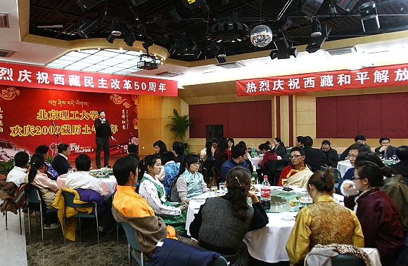 侯光明致新年贺词,他首先向所有的藏族同学们拜年,一声“洛萨扎西德勒”给大家送上了一年的祝福。他指出,西藏民主改革50年以来,藏族同胞和全国各族同胞一起,艰苦奋斗、奋发图强,努力发展经济,促进社会和谐,为祖国的发展做出了巨大的贡献。藏族历史悠久,文化源远流长,藏族人民勤劳智慧、热情善良,他们用坚定的信心和拥护民族团结的决心维护了藏区的社会稳定,保障了藏区的经济发展。我校的藏族同学是少数民族的优秀代表,希望大家能在大学中汲取更多的知识,毕业后为祖国的繁荣做出自己的贡献。
