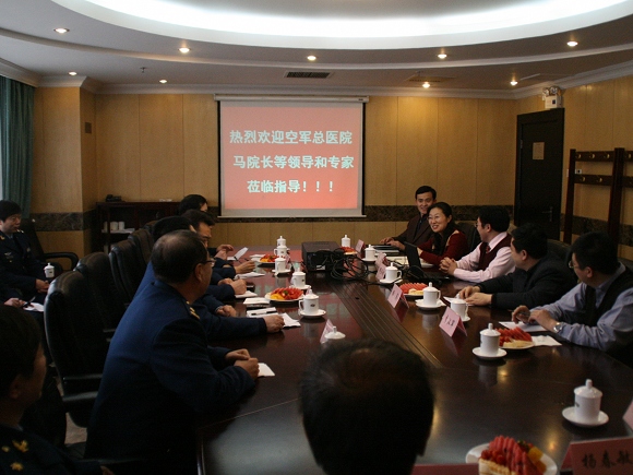 之后,邓玉林院长介绍了学校的历史沿革,并对生命学院的师资力量、科研平台、承担课题、研究领域、优势特色、发展思路等进行了详细的汇报,邓院长重点介绍了我院空间生物舱研究课题、中药现代化课题、老年痴呆症研究课题、生物标志物研究课题及生物芯片研究课题。马中立院长听完汇报对生命学院的现状和发展给予了充分肯定,并认为双方具有广泛的合作前景,并提出同生命学院在航空生物学方面进行深入合作的愿望。空军总医院也十分重视生理衰老、糖尿病、老年痴呆及帕金森病的病理研究,尤其对于航空动力与基础医学、“运动性”疾病进行了广泛和深入的研究,不但有十分丰富的飞行员生理病理样本,而且具有大量可供临床疾病研究的研究平台。通过合作,生命学院能更好地发挥其基础研究的优势,空军总医院也能在疾病研究领域方面取得长足进步。