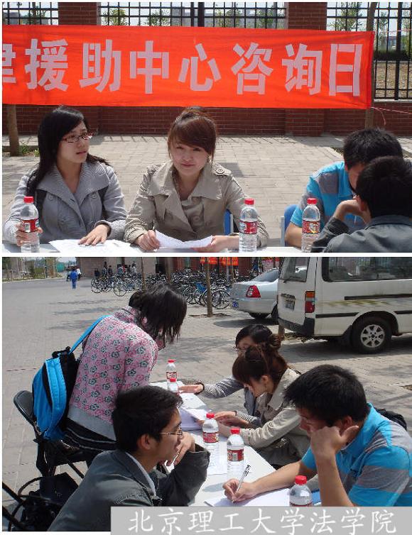同时,在良乡校区,法律援助中心另一部分成员也在静园开设咨询台,接受良乡师生的咨询,同时通过联系法学专业的学生党员,就法学专业学生的法律实务开展的意义及方式进行了交流,欢迎广大法学专业学生以法律援助中心为载体,在运用专业知识服务学校、社会的过程中,实现自身法律实务能力的提高。