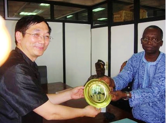 听说中国总领馆领导来到了拉各斯大学,外方院长迪欧罗?欧尼和穆伊瓦?法莱耶也都立即赶到了会议中心。至此,郭总领在“一线”见到了所有到位的孔子学院中外方成员。交谈中,郭总领不仅英语极娴熟、流利,还不时用约鲁巴语跟两位尼方院长对话,甚至还能用武汉话与来自湖北武汉的喻院长聊天,显示了一个外交官的个人魅力和交际禀赋。为表示敬意,尼方院长还代表拉各斯大学向郭总领赠送了拉各斯大学纪念品。