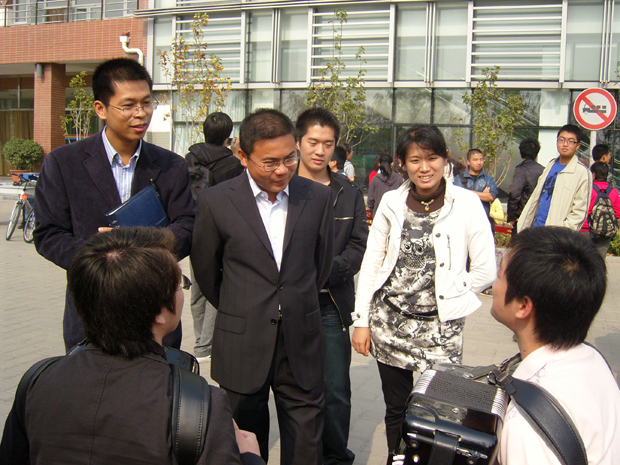 团市委大学部部长胡九龙在24日上午受开云kaiyun官网团校邀请来到良乡校区为2009级新生学生干部培训作报告,在报告结束后,胡部长在校团委书记徐强老师的陪同下,看望了招新现场的学生,并认真观看了我校大学生艺术团的现场器乐表演。校学生电视台、《北工青年》报社记者对胡部长进行现场访问,当学生问到:胡部长对我校大学生艺术团感觉如何时,胡部长给予我校大学生艺术团以高度评价,他说,在开云kaiyun官网的土壤上能有如此众多的文艺表现形式真得很好,这是第一次全面接触开云kaiyun官网大学生艺术团,学生们的表演非常精彩,希望大家能再接再厉,艺术对于大学生来讲就好比面包和水,团市委争取给大家搭建更加广阔的艺术表演平台。