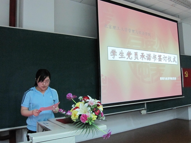 2010年6月2日19:00,管理与经济学院在研究生楼301举行了优秀学生党员、先进党支部表彰大会暨学生党员承诺书签订仪式。管理与经济学院党委书记李金林,副书记、副院长仇芳,本科生组织员曹瑞新,分团委书记彭明雪,研工委书记梁昊,分团委副书记何旭出席了此次仪式。管理与经济学院中关村校区全体学生党员参加了此次大会。