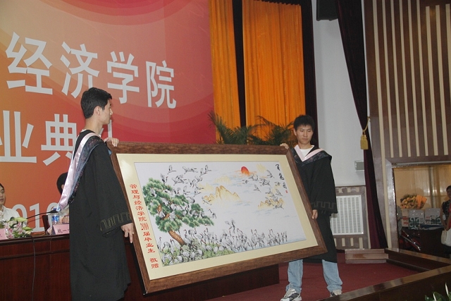 典礼上,优秀毕业生代表为主席台及前排就坐的学院领导、嘉宾代表献上鲜花,表达了学生对老师的崇高敬意和无比感激之情。同时,毕业生代表向学院赠送了礼品——白鹤图,何海燕副院长、孔昭君副院长代表学院接受礼品。毕业生们送上的真挚祝福,深深地流露了他们对学院及老师们四年来细心培养的感谢之意,全场响起了热烈的掌声。