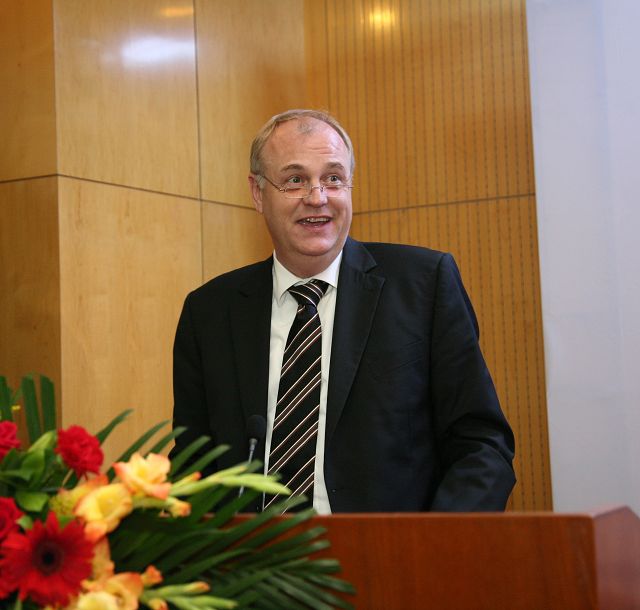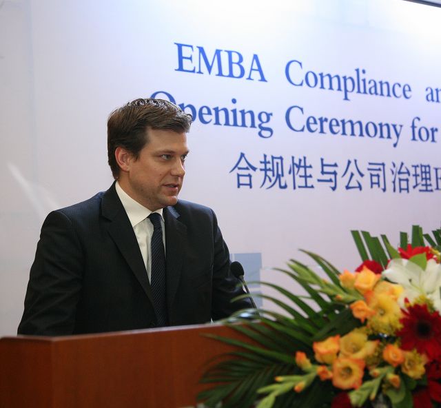 戴姆勒中国卡车公司总裁兼首席执行官Gerrit Marx博士致辞。他首先欢迎大家出席典礼,Gerrit Marx博士的致辞,对 “合规性与公司治理”高级工商管理硕士班的创办与发展给予了高度评价,指出学校与企业合作是学校企业共同发展的需要。Gerrit Marx博士说:“贵校与德国两所大学合作为戴姆勒公司举办EMBA班项目,是把全球最佳实践融入一个定制项目之中,从而满足在中国成功进行商业活动的需求。第四期学员顺利开学,说明了中国已是全球经济增长最快的国家,中国的经济发展给教育的优化整合带来了新的教育市场,校企强强联合互利双赢具有重要的现实意义和战略意义,我们为支持这个项目而感到非常自豪。”