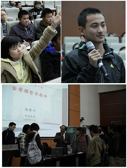 在讲座中同学们深入思考、认真记录讲座的内容。在靳希平教授讲座后,同学们积极向教授提问并得到教授耐心的解答。两个小时的讲座让同学们意犹未尽,会后同学们仍围在教授周围,向教授请教久久不愿离去。靳希平教授的讲座使大家得在了解古希腊语与古希腊历史的基础上有效启发了哲学思维,影响广泛,意义深远。