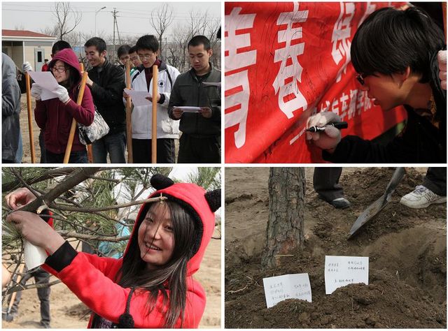 午饭后学生志愿服务队的同学们开展了“环保青春,绿色未来”主题团日活动,在领队同学的带领下全体志愿者服务队的同学齐声宣读了“环保青春、绿色未来”主题活动的倡议书,呼吁所有人为了绿色的未来,贡献我们的环保青春;团体活动第二项,同学们在“环保青春、绿色未来”的条幅上签上了自己的名字,旨在从我做起,保护我们的环境,营造绿色校园。随后同学们直奔植树地点,在园林师傅的带领下把一颗颗翠绿的小松树栽入了树坑中。在植树的过程中团日活动的第三项也随之展开,同学们在卡片上写上了对“环保青春、绿色未来”的寄语并把卡片挂到了小树苗上,同学们还把对未来期望写到了小信封内,并把它随着健硕的小树苗一起埋到了树坑里,寓意着同学们的绿色愿望将随着小树一起茁壮成长。