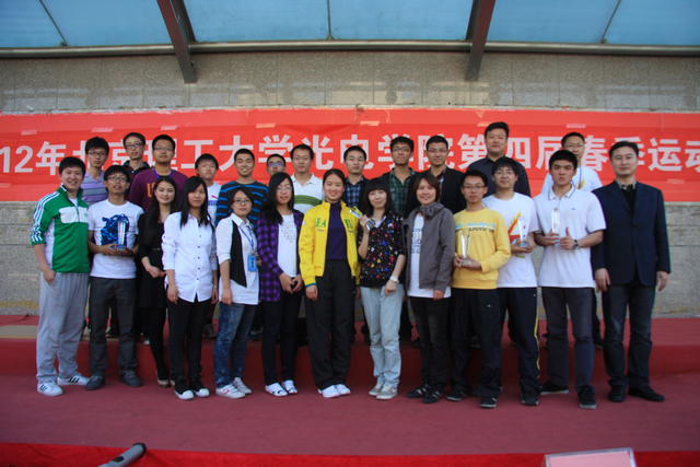 在此次学院运动会中,同学们赛出了风格,赛出了水平。最终,研一、09光电一班、09光信一班分别获得了团体总分前三的优异成绩,另有09光电四班和09光信二班秩序井然、表现突出,获得了本次运动会的精神文明奖。光电学院副书记副院长邹锐,分团委书记盛筠,研工委书记姜曼和08级辅导员汤琪分别为各获奖者颁奖,对其高昂的斗志和精神表示赞扬,对其取得的成绩表示祝贺。