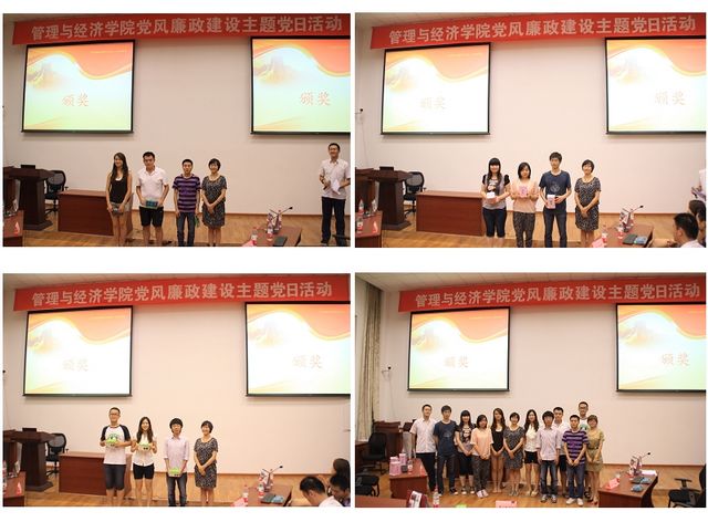 2012年5月28日晚7点,管理与经济学院党风廉政建设主题党日活动暨党史知识竞赛于主楼241顺利举行。管理与经济学院团委书记彭明雪老师以及学院50余名党员出席了此次竞赛。三支参赛队伍分别来自管理与经济学院2009级三个党支部,竞赛公证人由三个党支部的支部书记担任。