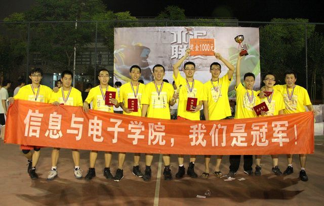 赛后的颁奖仪式上,身着总冠军纪念T恤、佩戴金牌的队员们在现场观众山呼海啸般的欢呼声中高高举起总冠军奖杯,大声喊出:信息与电子学院,我们是冠军!