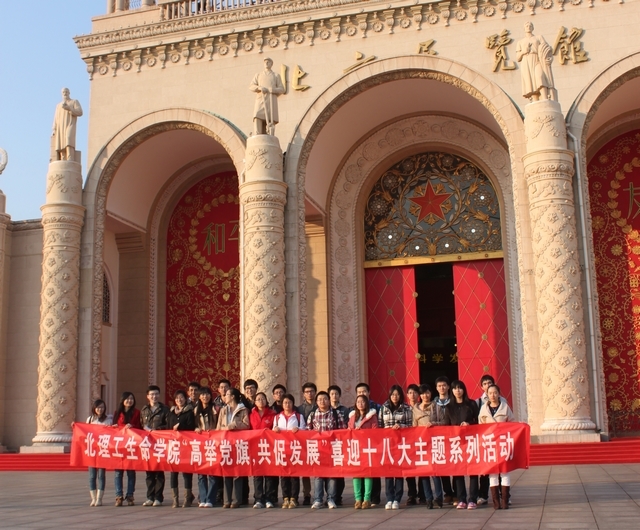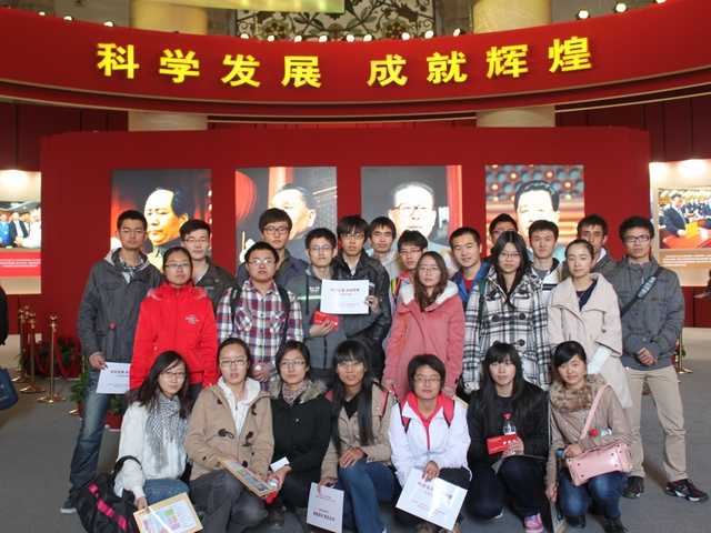 为了迎接党的十八大,提高学生队伍素质的建设水平,在院党委的领导下,生命学院共产主义学习实践会协同生命学院10级学生第一、二党支部和积极响应“十八大”号召, 于11月5日组织共学会骨干成员、支部党员和积极分子前往北京展览馆参观“科学发展 成就辉煌”大型图片展览。展览共分为10个部分,在“序篇”的展厅里,精美生动的图片再现了10年我们国家经历的一系列难忘的大事:成功举办北京奥运会、应对汶川大地震等自然灾害、成功举办上海世博会、建国60周年等等令人难忘、意义深远的大事。同学们看到周围这些图片,感慨万千。