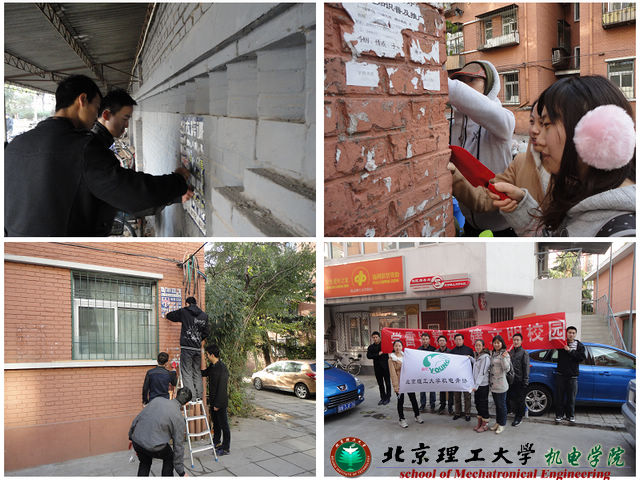 2012年11月11日,学院青年志愿者协会与10级弹药团支部一起来到北理家属院社区,帮助清理社区墙面上小广告和违规粘贴的宣传资料。当天早上,大家冒着严寒,用小铲子和矿泉水瓶作工具,一丝不苟地清理墙面上的广告,遇到不方便使用小铲子的地方,同学们便直接用手去清理。经过一上午努力,社区墙面恢复了原来的整洁。看着整洁的墙面,同学们冻得通红的脸上露出开心的笑容。