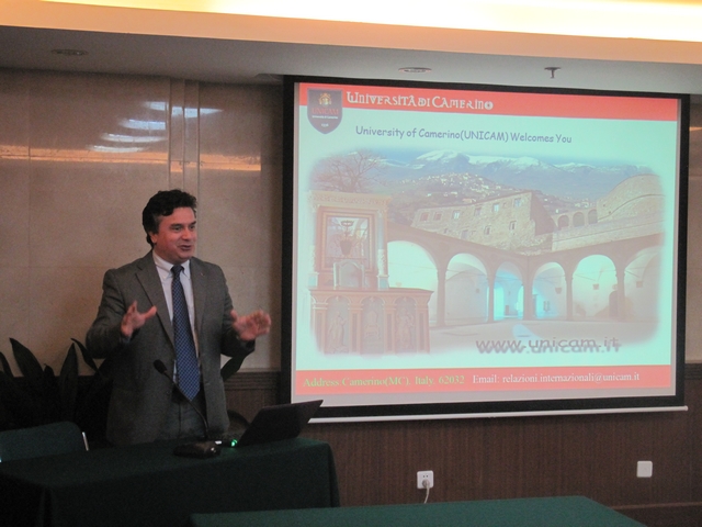 首先是Flavio Corradini教授给大家介绍卡梅里诺大学的概况,包括他在意大利的位置和办学理念,让我们了解到了国外大学成熟的办学方式,包括学士,硕士,博士的课程设计,学院设置,和学生培养的模式。强调了意大利大学为学生着想的以学生为本的办学模式,包括,对学生生活的安排,可对学生在学习期间培养国际化眼光的交流项目,和校企联合对学生进行教育,学生重在保持学生的创造力的办学理念。上图为Flavio Corradini教授精彩演讲的照片。