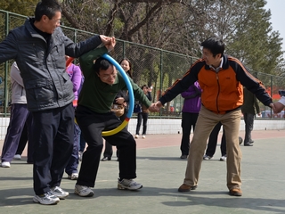 此次教工运动会的比赛项目共有三项:运球夹球、瞎子敲锣和传递呼啦圈。项目不仅起到锻炼身体的作用,并具有一定的科技含量与趣味性。比赛时,老师们兴致勃勃,积极参与,并琢磨技巧与方法,使每个项目都显得是那么的与众不同。赛场上欢呼声、喝彩声、加油声不绝于耳,特别是“瞎子敲锣”环节,场外围观的教职工纷纷为选手们支招加油,现场气氛被推向了高潮,教工们充分展示了“快乐第一,比赛第二”的趣味运动会精神。
