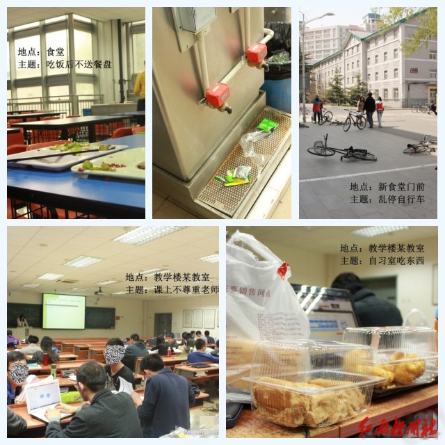 为举办反思文化展,信息与电子学院红雨新闻社派出多路记者在校园中拍摄了多组照片,这些照片反映出发生在大学生身边的不文明现象。一组组刺眼的照片上传至官方微博、公共主页和学生工作平台后,引发了广大同学对于维护校园文明、弘扬校园文化的热烈讨论。同学们纷纷留言转发,自我反省,有则改之,无则加勉。“反思”,把积极向上、充满希望的正能量传递给每一个人。
