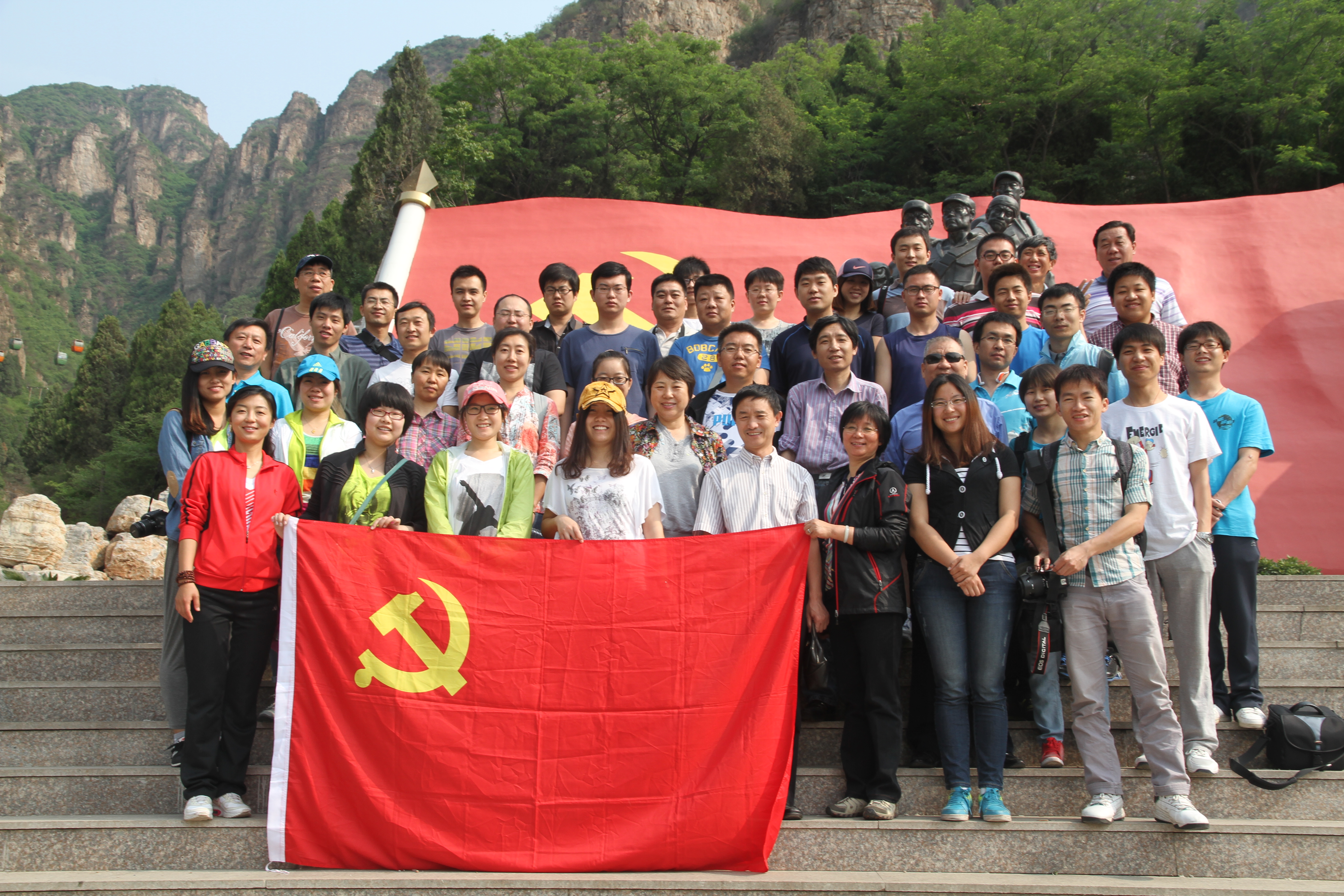 全体教工登上了狼牙山的主峰棋盘陀,瞻仰了五勇士纪念塔,并在最高点远观五勇士的跳崖地点,怀着崇敬的心缅怀革命先烈。