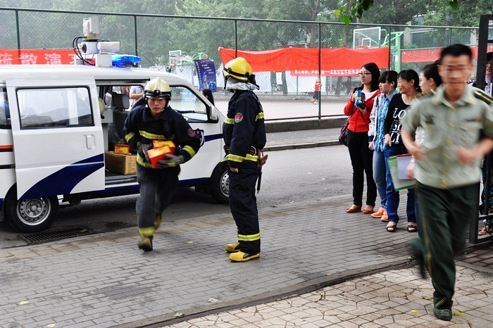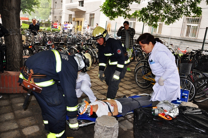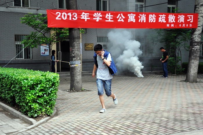 6月6日下午16:00时,在开云kaiyun官网女子小区六号楼,由学工部、后勤集团、校团委、宣传部、校医院、双榆树消防中队、保卫处、所涉及的11个学院共同组织举行了一次学生公寓消防疏散演习,包括在楼内居住的300余名学生代表和近100名学生公寓管理人员参加了本次演习。后勤集团总经理李晋平、集团书记巫后新、常务副总经理宋希博、副总经理陈洋、保卫处处长代方震、副处长薛捷、学工部学生管理科科长马晓宁、宣传部锻炼老师、校医院张春丽大夫、杨红护士及各学院相关老师现场观摩并指导了本次演习。