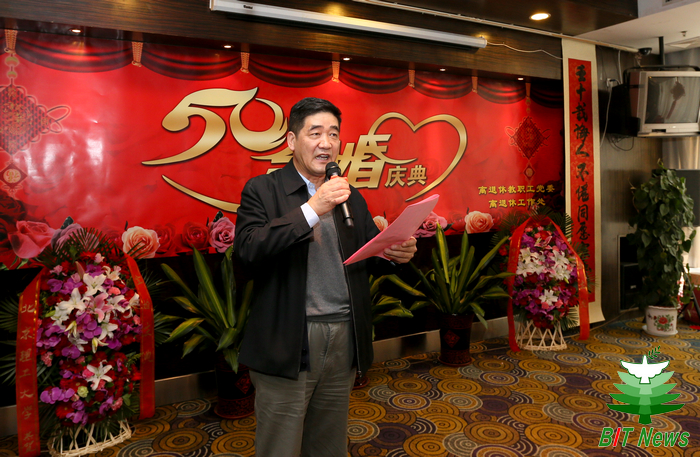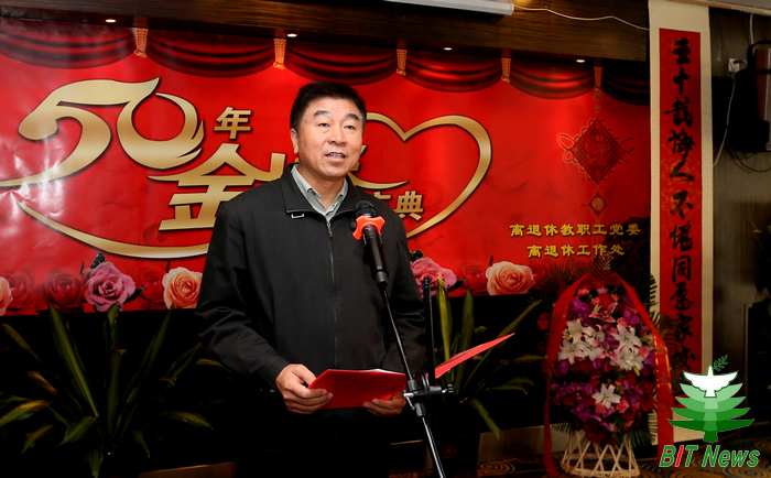 校党委书记郭大成致贺词,代表学校党委向全体金婚伉俪表示崇高的敬意和衷心的祝贺!郭书记高度赞扬了金婚伉俪们对美好生活的不懈追求和对甜蜜爱情的矢志不渝,引领了家庭和睦、代际和顺、社会和谐的良好风尚。他指出老一辈北理工人怀着对党的教育事业的无限忠诚,辛勤付出,为学校又好又快的发展奠定了坚实的基础。在新时期,老同志们仍满怀对学校炙热的情感,在我校开展群众路线教育实践活动中,积极为学校发展建设建言献策,奏响了老同志“共筑中国梦”的响亮号角,以老骥伏枥志在千里的豪情老有所为,绽放出夕阳红的壮丽光辉。在老同志们的支持、理解和帮助下,全校师生共同努力,必将迎来开云kaiyun官网新的辉煌!
