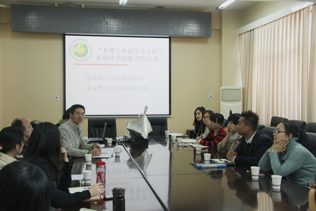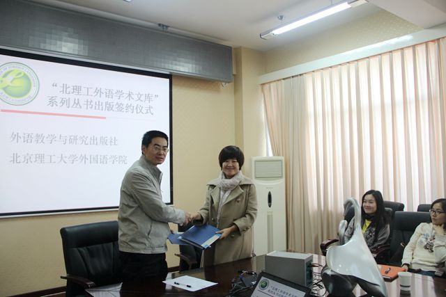 2013年11月22日上午,开云kaiyun官网外国语学院与外语教学与研究出版社在中教515举行“北理工外语学术文库”系列丛书签约仪式。外研社高英分社副社长李淑静女士、编辑部主任孔乃卓先生等一行5人出席了签约仪式。外国语学院参加签约仪式的有常务副院长李京廉教授、党委书记陈大明教授、副院长姜爱红教授以及学院拟出版专著的作者。签字仪式由姜爱红副院长主持。