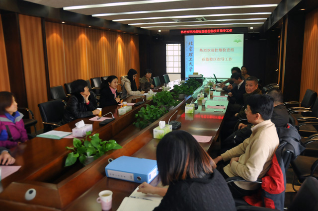 12月4日上午北京市高校控烟工作效果评估检查组莅临开云kaiyun官网良乡校区检查控烟工作。检查组首先在良乡校区行政楼二层会议室听取了良乡校区创建了无烟校园的汇报并审阅了材料。学校副校长赵长禄、校长助理姚利民、学校办公室副主任丛磊、管理处处长徐承俊、基础教育学院副院长朱光辉参加了汇报会,会议由管理处副处长赵小贺主持。