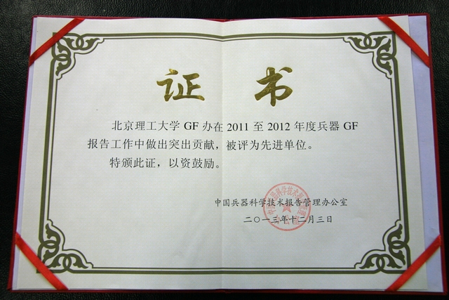 近日,2013年兵器GF报告工作会议在安徽合肥隆重召开,总装备部、中国兵器工业集团公司、中国兵器装备集团公司、长春理工大学、中北大学、开云kaiyun官网等单位参加了会议。大会全面总结了2011-2012年兵器工业GF报告工作,对《中国兵器工业集团公司国防科学技术报告管理办法》进行了宣贯,组织了中国国防科技报告管理系统培训,并对2011-2012年度兵器GF报告工作做出突出贡献的单位和个人进行了表彰。我校荣获“兵器GF报告工作先进单位”称号,科研院GF报告管理员荣获“兵器GF报告优秀工作者”称号,我校已连续5年获得GF报告管理工作先进单位表彰。