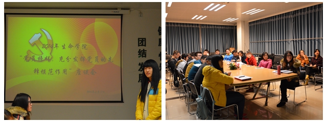 2014年11月17日晚7点,生命学院共学会在5号楼712会议室举办2014生命学院“党员榜样 充分发挥党员先锋模范作用”座谈会。此次活动旨在激励各入党积极分子向优秀党员学习,树立榜样,并在生活中起到先锋模范作用。生命学院11级优秀本科生党员张行健、董一名应邀出席此次座谈会。座谈会由生命学院辅导员李恒月主持。