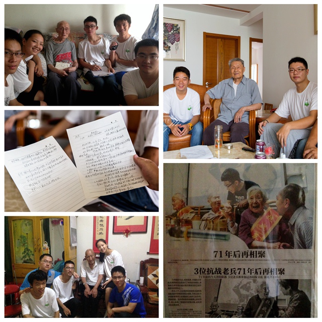 颜禄淼同学所在的实践团队,拜访了许多昔日的抗日英雄——投笔从戎的叶于良老人,卫生队的张翠萍老人,微山湖游击队的政委孙新民老人等;曹文涛同学的实践团队,同样对老兵给予了关注,拜访了参加淞沪战役等大战的范希贤老人,罗启忠老人等。