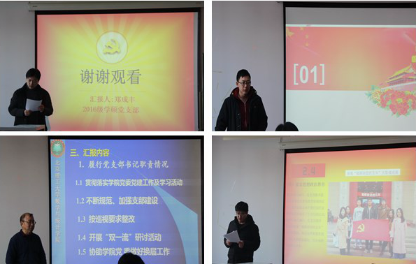 参与述职的党支部书记按照本科生、硕士生、博士生、教工党支部的顺序依次进行述职。每名党支部书记均以PPT形式汇报一年来支部开展的工作会议、理论学习、实践教育等活动,并对支部在学习贯彻“十九大”精神、“三会一课”制度落实以及持续推进“两学一做”的情况进行了详细介绍,通过活动图片与资料充分展示支部一年来的工作成果;同时,每名党支部书记对目前存在的问题进行了深入剖析,并对未来支部工作进行了规划与展望。述职环节精彩纷呈,台下掌声连连。