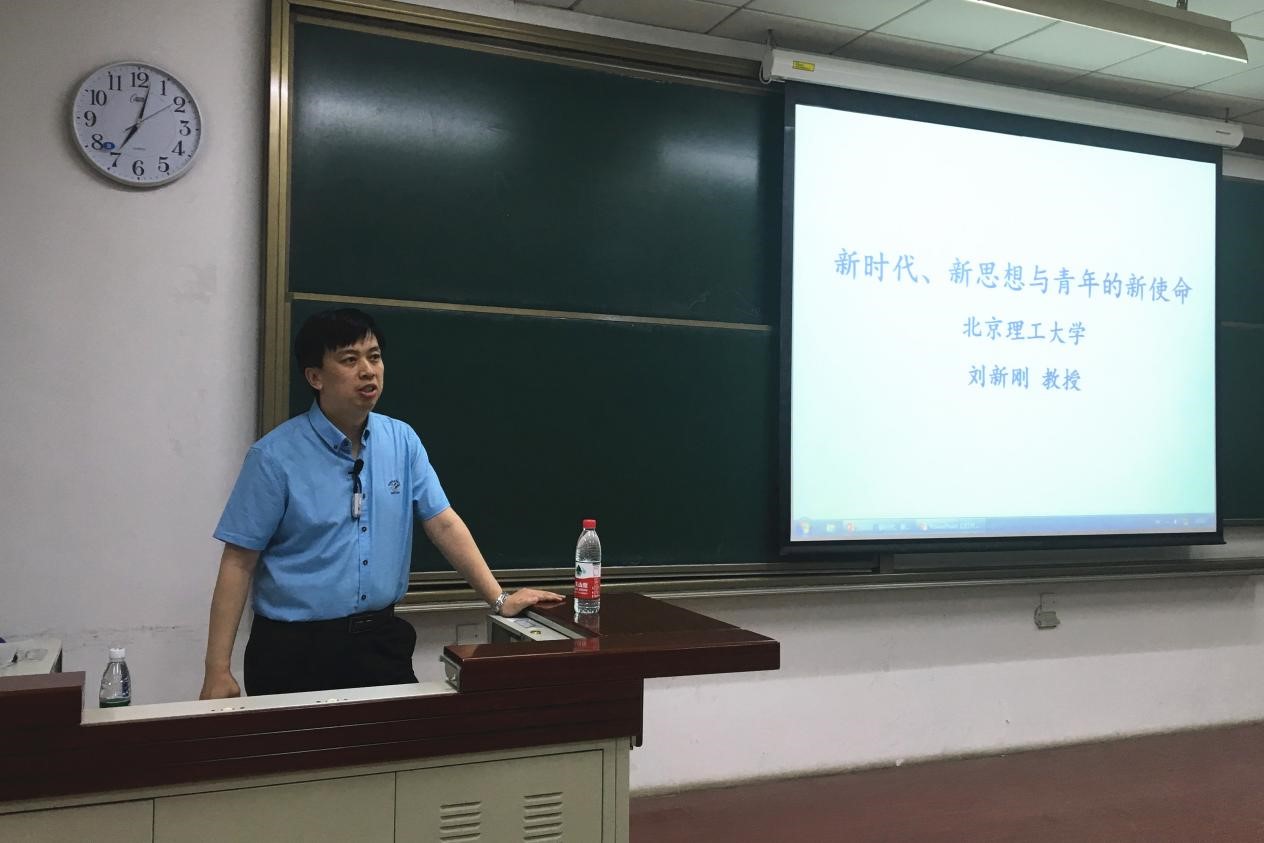 刘新刚讲解了习近平总书记在北京大学师生座谈会上的重要讲话,勉励同学们牢记自己肩负的中华民族伟大复兴历史使命,在新时代中加强理论学习,勇于创新,努力奋斗,做一名“时代新人”,在实现中国梦的生动实践中放飞青春梦想,在为人民利益的不懈奋斗中书写人生华章。