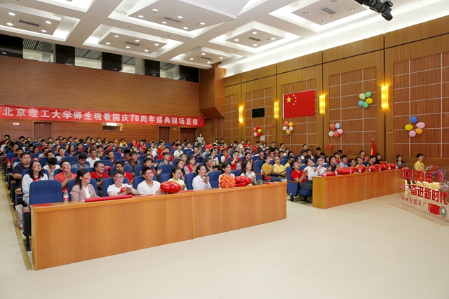 10月1日,庆祝中华人民共和国成立70周年大会在北京天安门广场隆重举行。中共中央总书记、国家主席、中央军委主席习近平出席大会并发表重要讲话。在这举国同庆的重要时刻,学校在中关村校区和良乡校区设置了直播会场,组织在校学生观看庆祝中华人民共和国成立70周年大会、阅兵和群众游行的直播。