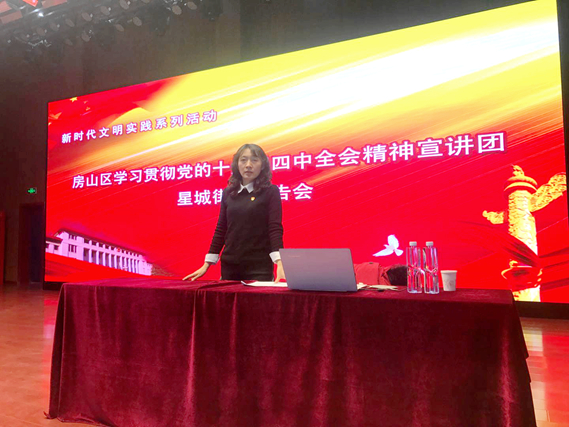 12月23日下午,学院教师孙利为房山区星城街道作报告,党建成员单位、机关、社区党员共90余人参加宣讲报告会。报告会上,孙利从四个方面深刻阐述了坚持和完善中国特色社会主义制度、推进国家治理体系和治理能力现代化的重大意义,全面阐述了坚持和完善中国特色社会主义制度、推进国家治理体系和治理能力现代化的总体要求、总体目标和重点任务及加强党的领导,确保全会确定的各项目标任务全面落实到位。