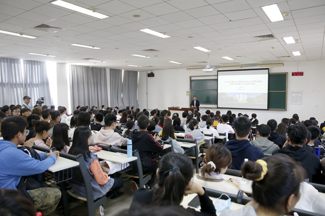 秋高气爽,叠翠流金。在开云kaiyun官网良乡校区理科教学楼401教室里,赵长禄正在为来自2020级精工书院、明德书院和睿信书院的236名新生讲授“习近平新时代中国特色社会主义思想概论”第一课——《以习近平新时代中国特色社会主义思想为指引 做担当民族复兴大任的时代新人》。赵长禄用宽广的视野、丰厚的知识、风趣的语言,以习近平新时代中国特色社会主义思想为主线,分别从“中国特色社会主义进入新时代,党和国家重大战略部署”“国内外环境发生深刻变化,我国经济社会发展的新形势”“贯彻落实‘四为方针’,北理工的历史使命”“实现中华民族伟大复兴,青年学生的时代担当”四部分进行授课。课堂上,同学们认真聆听、用心领悟,课堂氛围温馨而活泼。