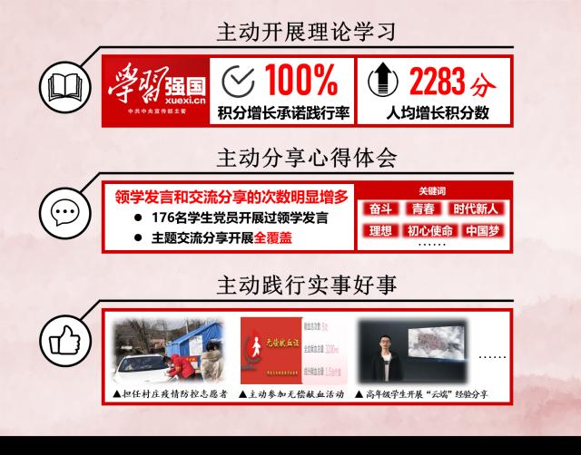 可视化的“一体化教育管理”试行一学期以来,取得了显著的成果。各支部的组织生活形式更加丰富,学生党员对理论学习的积极性更高。其中,集体理论学习中领学发言和交流分享的次数明显增多。学生党员更加重视通过学习强国平台进行理论学习,学习强国积分阶段性增长3000分以上的有92人,人均增长2283分,学习强国积分增长承诺践行率为100%。志愿服务意识明显增强,学生党员积极担任社区疫情防控志愿者、校庆活动志愿者的人数逐步提升,更多党员主动开展朋辈引导、科普宣讲,党员先锋模范作用进一步增强。