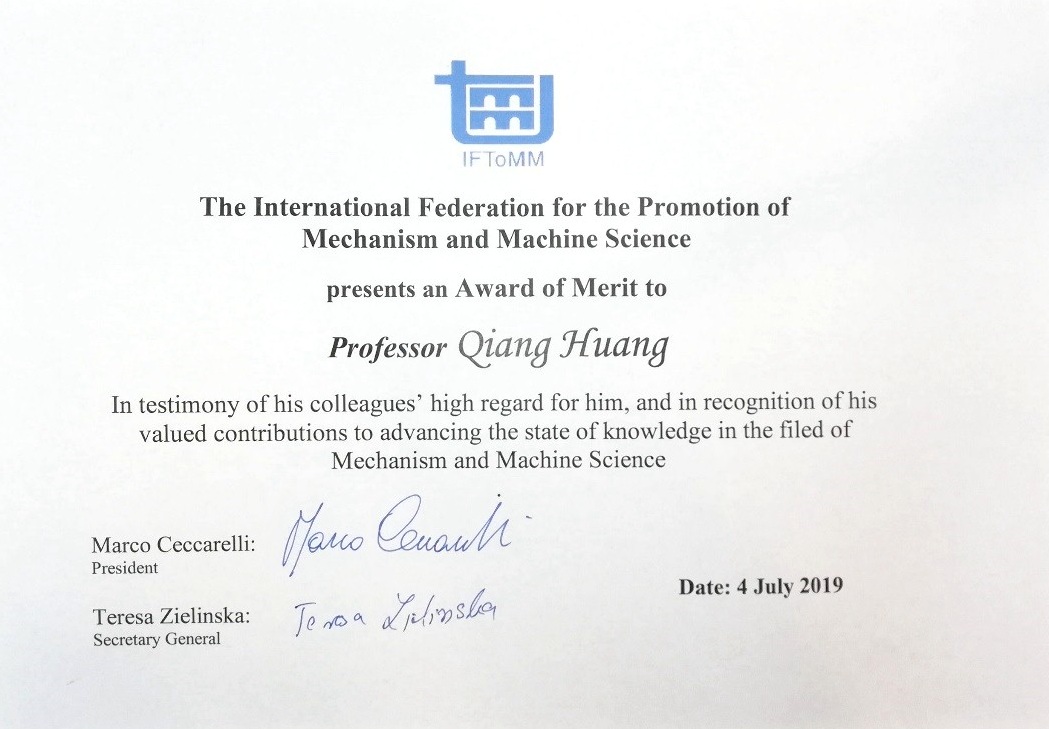 北理工黄强教授荣获国际机构学和机器科学联合会(IFToMM)“卓越成就奖”