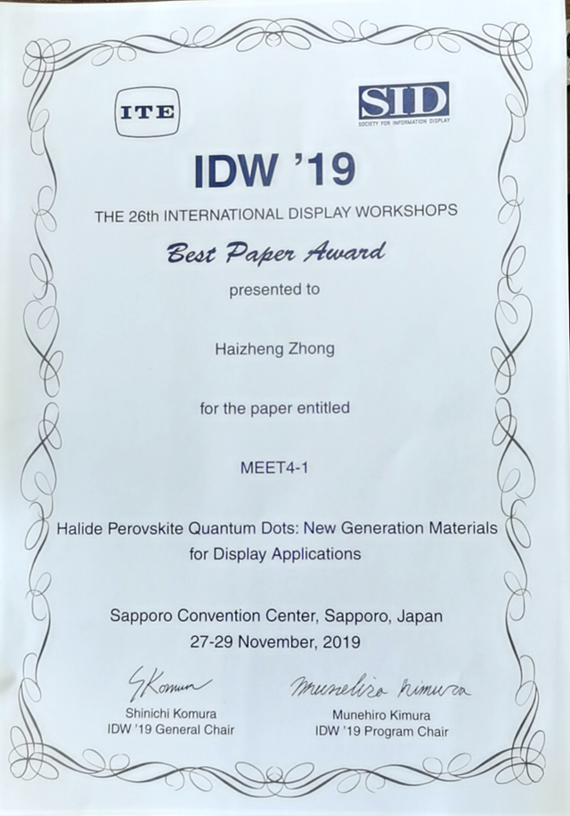 日前,第26届International Display Workshop (IDW 2019)组委会宣布了2019年最佳学术论文奖(Best Paper Award)和最佳墙报奖(Best Poster Award)的获奖名单,北理工材料学院钟海政教授报告的论文“Halide Perovskite Quantum Dots: New Generation Materials for Display Applications”获得最佳论文奖。