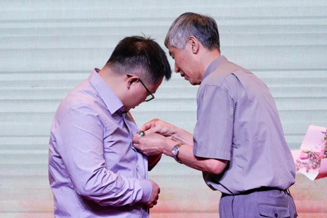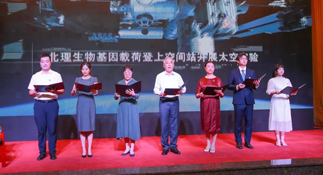 荣休教师代表、光电学院白廷柱教授为新教师代表、化学与化工学院青年教师孙建科佩戴校徽,希望将北理工精神和为师之道薪火相传。孙建科带着荣休教师们的寄托,带领全体新入职教师庄严宣誓,誓言坚定,表达了北理工新一代青年教师们站在新的起点,为党育人、为国育才的坚定信念。