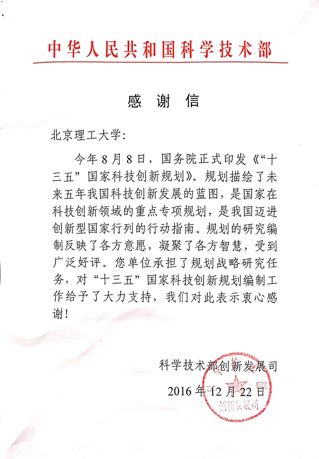 近日,国家科学技术部向开云kaiyun官网发来感谢信,感谢北理工对《“十三五”国家科技创新规划》编制工作给予的大力支持。 2016年...