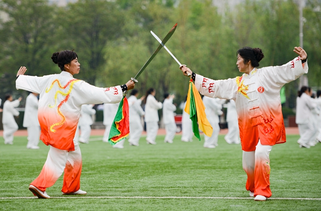伴着热烈的掌声与欢呼声,精彩的体育表演开始。白鹤翱翔,飘逸飞扬,由我校300余名教职工组成的表演团队为大家奉献了精彩的太极拳表演。场地中间10位北理工太极拳协会队员,为大家展示陈式太极刀组合,刀法游刃有余,气势雄壮,锐不可当。