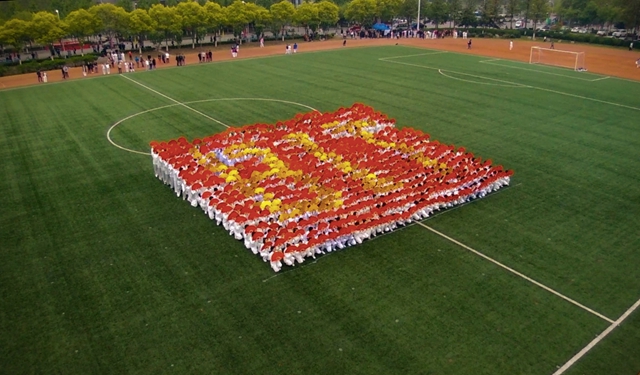 由8个书院的640名学生组成的表演方阵为大家带来精彩功夫扇表演。收扇、蓄势、出拳,动作整齐划一,他们用场下无数次刻苦训练迎来表演场上的精彩绽放,娴熟的一招一式间尽显属于学子们的青春与自信。手中的扇面依次相接,一道道红色的波浪随着音乐涌动,共同舞出一片激情的海洋。同学们抖动手中的扇面,依次摆出了“BIT ”“2019”的字样,表达出北理工莘莘学子对国家、学校的热爱与希望,为实现民族梦、强国梦、中国梦而奋斗的信心与决心。