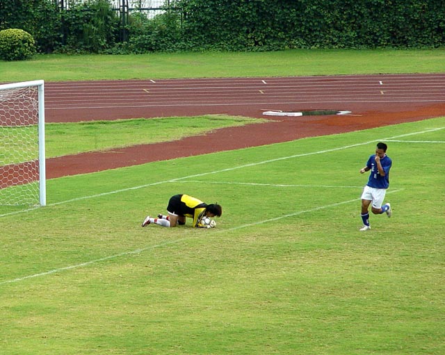 对方守门员面对连续不断的进攻,显得有点手忙脚乱。