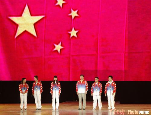 更大的惊喜引燃了全场的欢呼——杜丽、王义夫、张怡宁、张国政、王旭、陈艳青6位在本届奥运会上勇夺金牌的选手,风尘仆仆地赶来,与祖国各地的大学生一同分享青春运动盛会的欢乐。