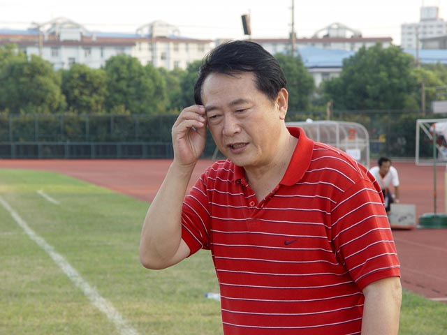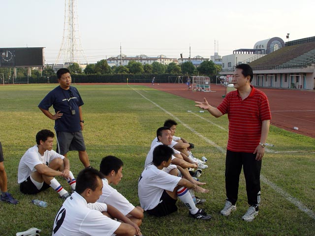 金志扬教练在告诫队员要学会用脑子踢球,不要急躁,要稳扎稳打。