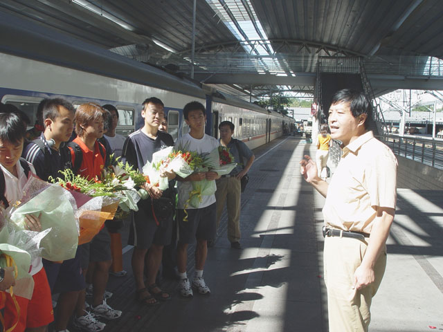 我校副校长侯光明率部分师生到车站站台欢迎健儿归来。
