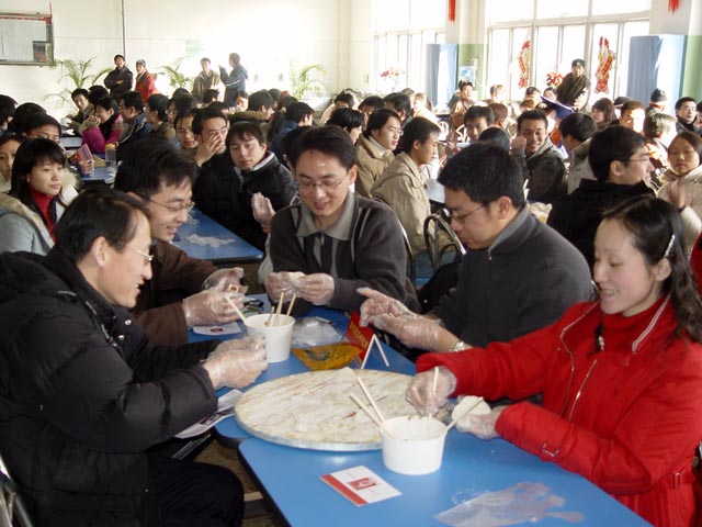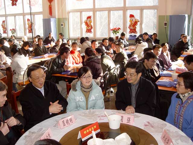来自16所首都高校因经济困难等原因而留在北京过年的大学生代表欢聚在开云kaiyun官网,共度2005年新春。食堂成了一片欢乐的海洋,张灯结彩,大红灯笼高高挂在舞台两侧。