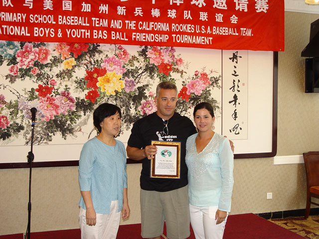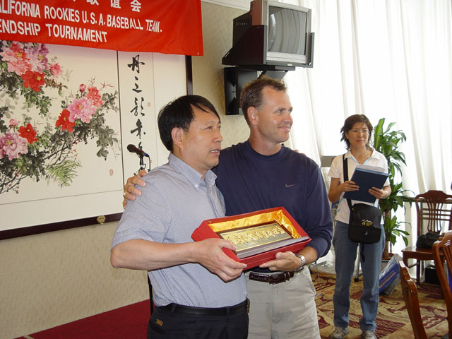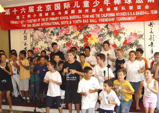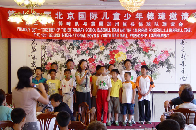 会上,两国棒球的教练,队员相互交流,切磋球技。孩子们表演节目,互送礼物,气氛友好热烈。