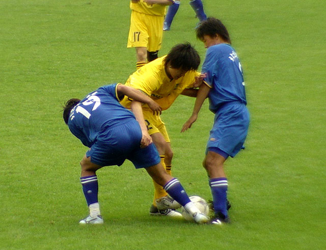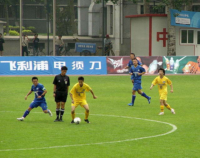 今天的比赛双方,一为飞利浦中国大学生足球联赛“三连冠”,一为东道主,而且两队队员的关系还有一定的渊源,上半场比赛双方处于试探阶段,都踢得比较谨慎。